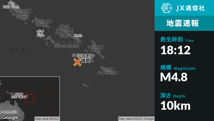 11月22日 18:12頃、ソロモン諸島のMalangoから南西20kmの地点でM4.8の地震がありました。