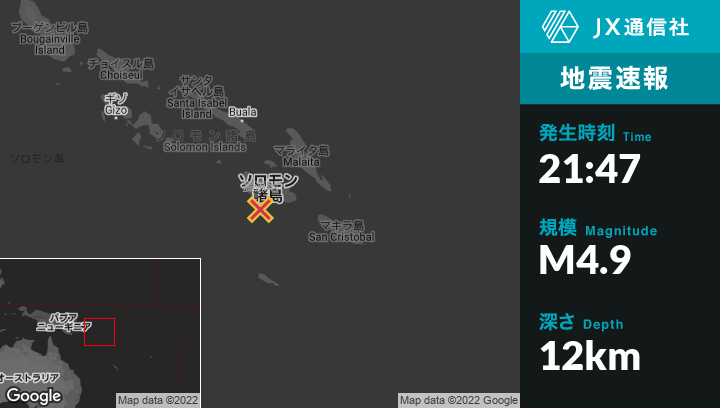 11月22日 21:47頃、ソロモン諸島のMalangoから南東43kmの地点でM4.9の地震がありました。