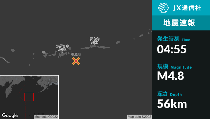 11月28日 04:55頃、アラスカのAdakから東南東80kmの地点でM4.8の地震がありました。