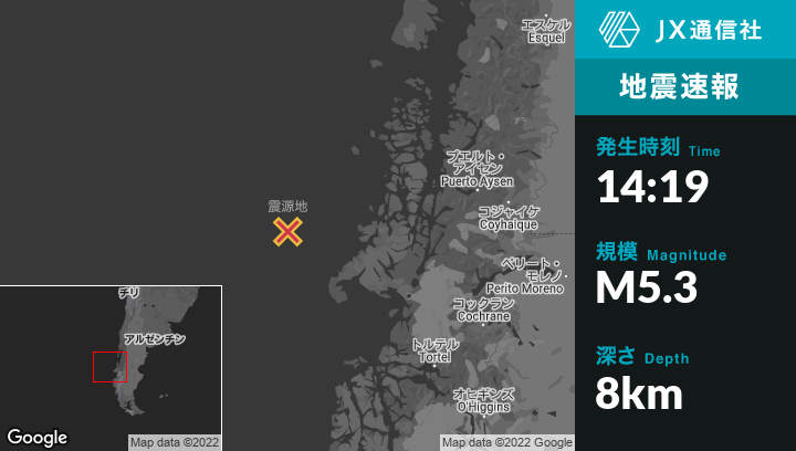 12月30日 14:19頃、チリのPuerto Chacabucoから西287kmの地点でM5.3の地震がありました。
