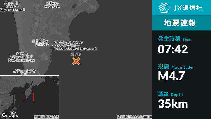 | 震源地 | ロシアのPetropavlovsk-Kamchatskyから東南東139kmの地点 |