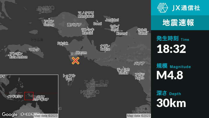 1月03日 18:32頃、インドネシアのTualから北北東196kmの地点でM4.8の地震がありました。
