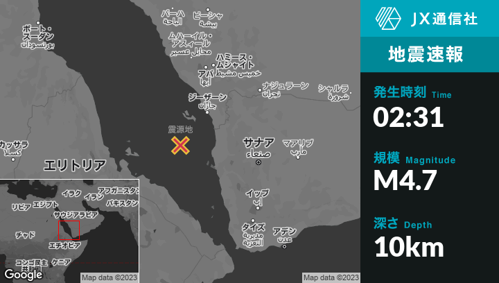| 震源地 | サウジアラビアのFarasānから南南西89kmの地点 |