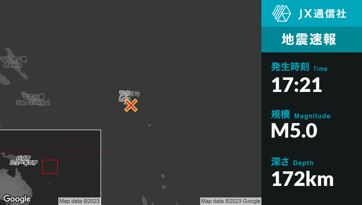 1月10日 17:21頃、ソロモン諸島のLataから東28kmの地点でM5.0の地震がありました。