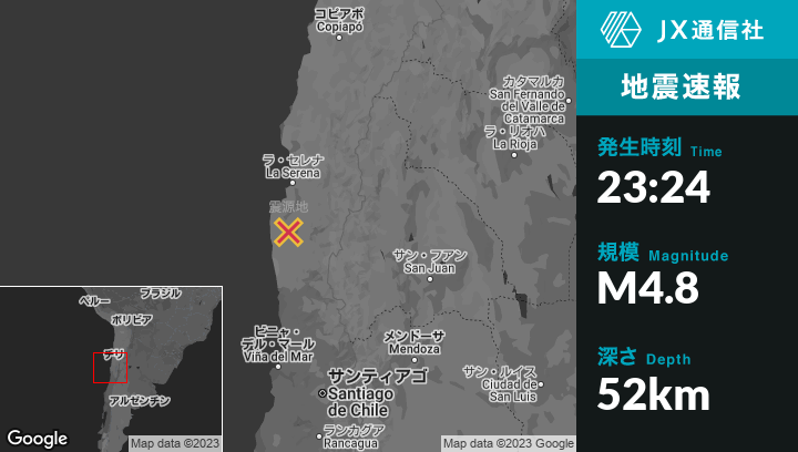 1月12日 23:24頃、チリのOvalleから西南西14kmの地点でM4.8の地震がありました。