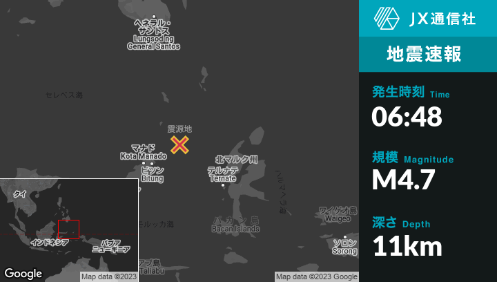 1月13日 06:48頃、ライキット II (ディメンベ)、インドネシアのLaikitから東北東135kmの地点でM4.7の地震がありました。
