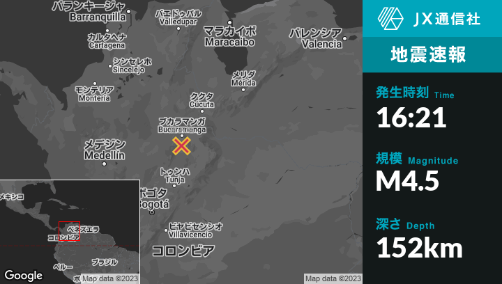 | 震源地 | コロンビアのPiedecuestaから南西13kmの地点 |