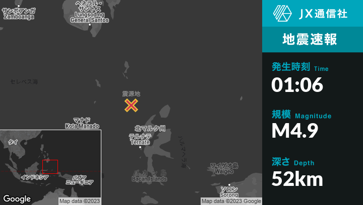 1月19日 01:06頃、インドネシアのTobeloから北西159kmの地点でM4.9の地震がありました。