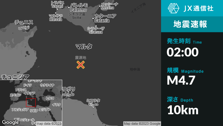 | 震源地 | マルタのŻurrieqから南南西102kmの地点 |