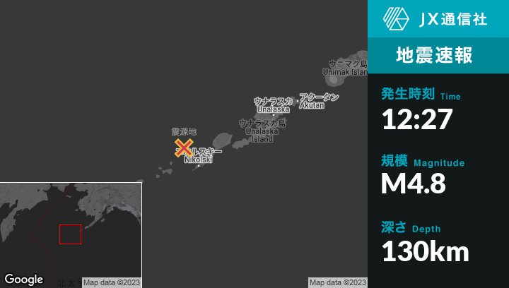 1月22日 12:27頃、アラスカのNikolskiから北西53kmの地点でM4.8の地震がありました。