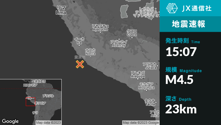 1月22日 15:07頃、ペルーのSan Juanから西北西58kmの地点でM4.5の地震がありました。