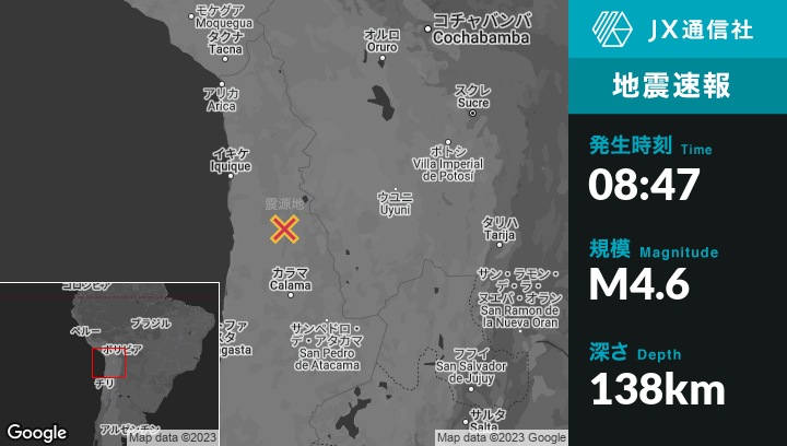 2月28日 08:47頃、チリのCalamaから北149kmの地点でM4.6の地震がありました。