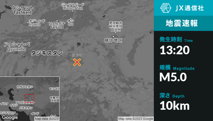 2月28日 13:20頃、タジキスタンのMurghobから西59kmの地点でM5.0の地震がありました。