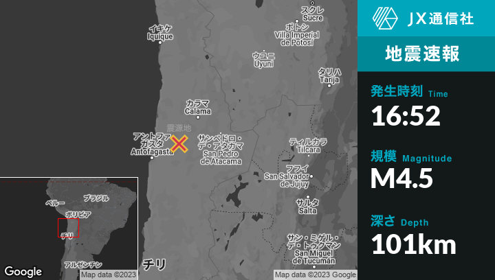 3月07日 16:52頃、チリのCalamaから南西98kmの地点でM4.5の地震がありました。