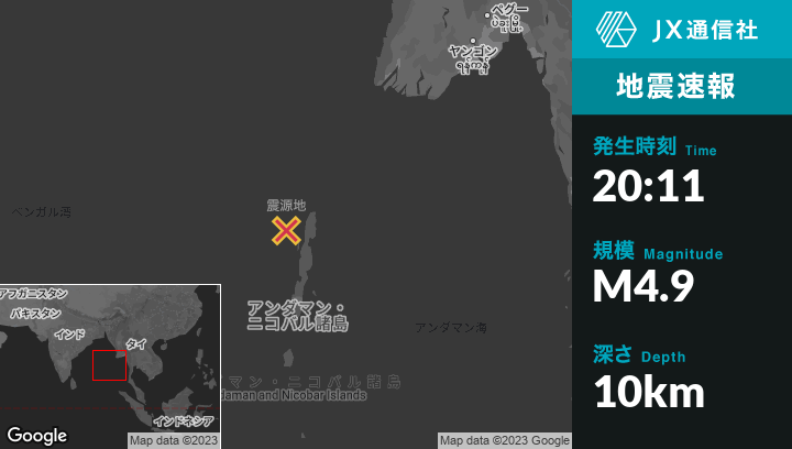 3月07日 20:11頃、インドのBamboo Flatから北181kmの地点でM4.9の地震がありました。