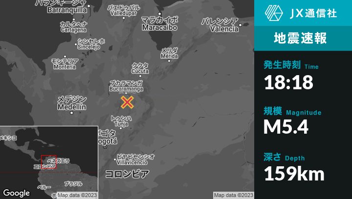 3月10日 18:18頃、コロンビアのJordánから北12kmの地点でM5.4の地震がありました。