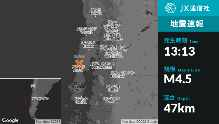 3月11日 13:13頃、チリのAncudから北66kmの地点でM4.5の地震がありました。