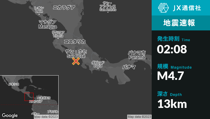 | 震源地 | コスタリカのQueposから南38kmの地点 |