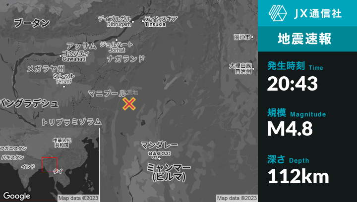 3月12日 20:43頃、インドのWāngjingから東南東76kmの地点でM4.8の地震がありました。