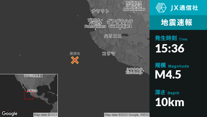 3月15日 15:36頃、メキシコのJosé María Morelosから南西212kmの地点でM4.5の地震がありました。