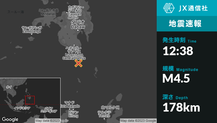 3月17日 12:38頃、フィリピンのSaranganiから南51kmの地点でM4.5の地震がありました。