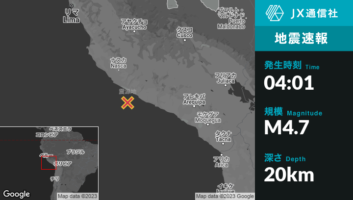3月21日 04:01頃、ペルーのAtiquipaから南南西41kmの地点でM4.7の地震がありました。