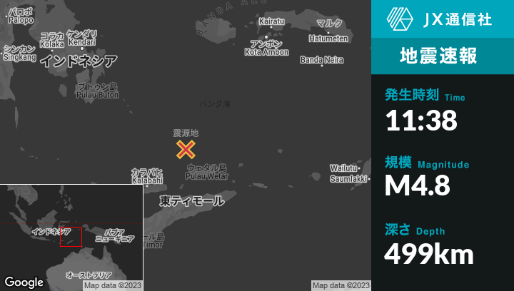 3月24日 11:38頃、東ティモールのMetinaroから北171kmの地点でM4.8の地震がありました。