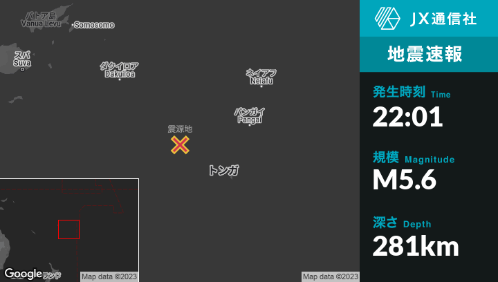 3月24日 22:01頃、トンガのHavelulotoから北西170kmの地点でM5.6の地震がありました。