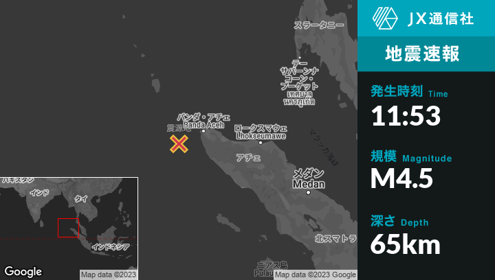 | 震源地 | インドネシアのBanda Acehから西南西94kmの地点 |