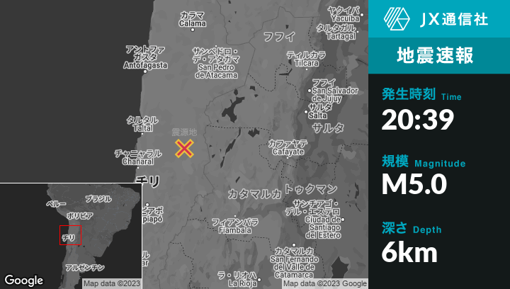 | 震源地 | チリのDiego de Almagroから北東114kmの地点 |