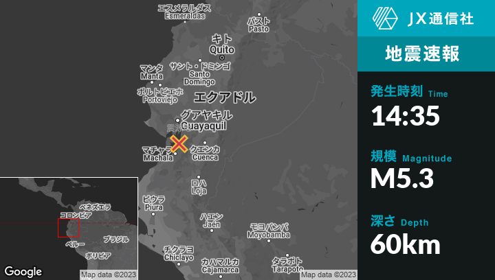 4月25日 14:35頃、エクアドルのBaláoから北北西10kmの地点でM5.3の地震がありました。