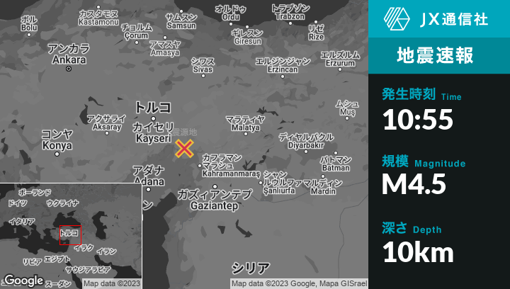4月29日 10:55頃、トルコのGöksunから北北西9kmの地点でM4.5の地震がありました。