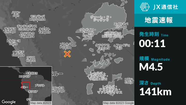 5月03日 00:11頃、ペルーのSan Fernandoから南南東30kmの地点でM4.5の地震がありました。