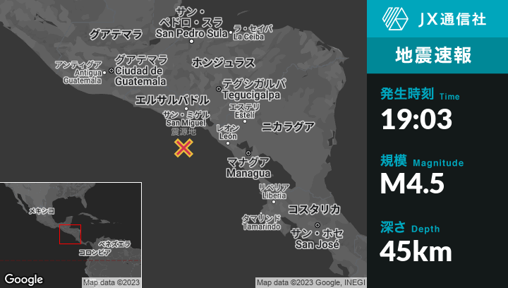 5月03日 19:03頃、エルサルバドルのIntipucáから南南西90kmの地点でM4.5の地震がありました。
