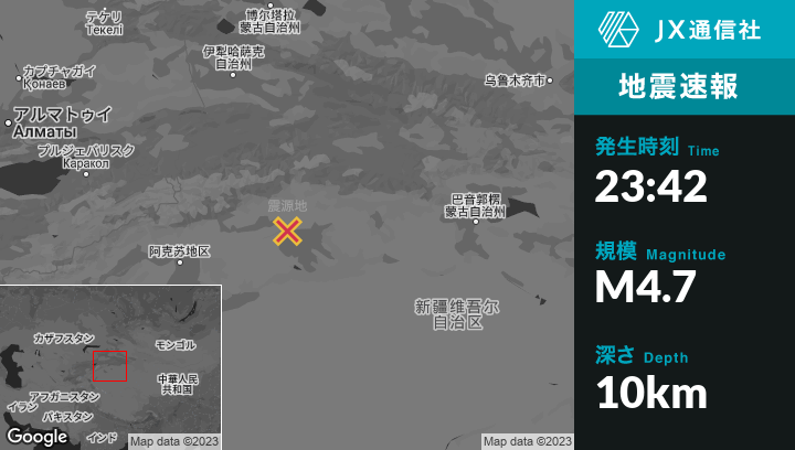 5月23日 23:42頃、中国のKuqaから西45kmの地点でM4.7の地震がありました。