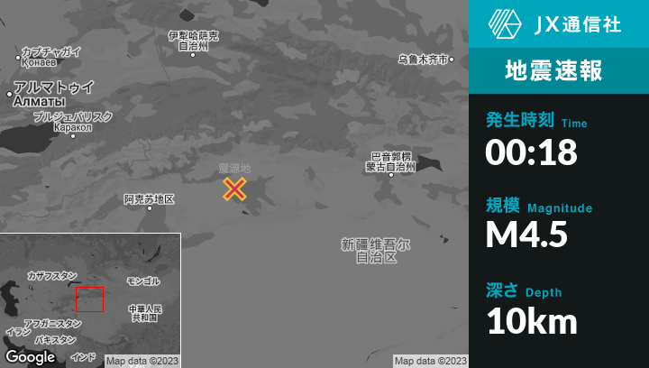 5月24日 00:18頃、中国のKuqaから西南西51kmの地点でM4.5の地震がありました。