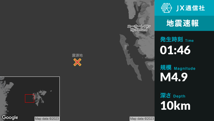 | 震源地 | スバールバル諸島とヤンマイエン島のLongyearbyenから西189kmの地点 |