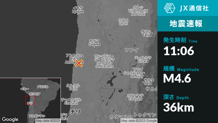 5月28日 11:06頃、チリのAntofagastaから北東42kmの地点でM4.6の地震がありました。