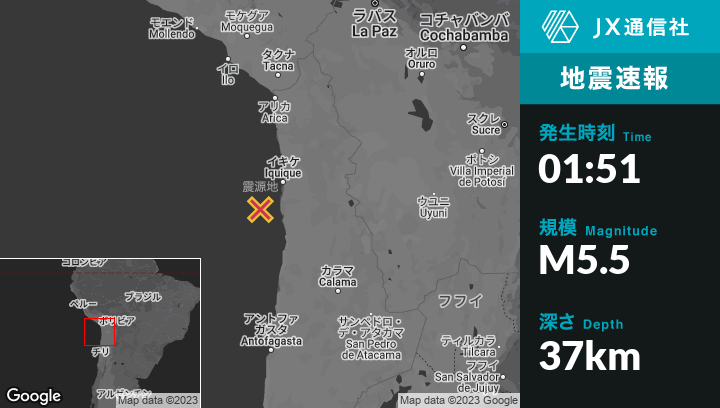 5月31日 01:51頃、チリのLa Tiranaから南西68kmの地点でM5.5の地震がありました。