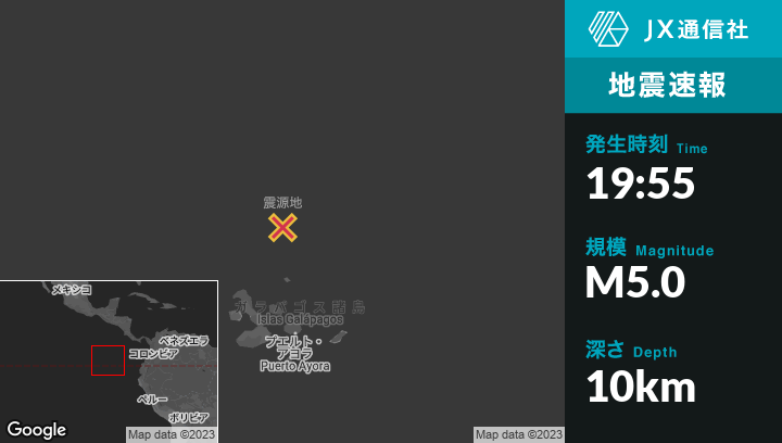 5月31日 19:55頃、エクアドルのPuerto Ayoraから北250kmの地点でM5.0の地震がありました。