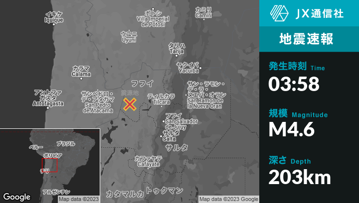 | 震源地 | アルゼンチンのSan Antonio de los Cobresから北北西103kmの地点 |