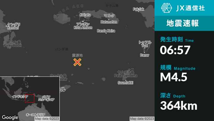 6月03日 06:57頃、東ティモールのLospalosから北北東236kmの地点でM4.5の地震がありました。
