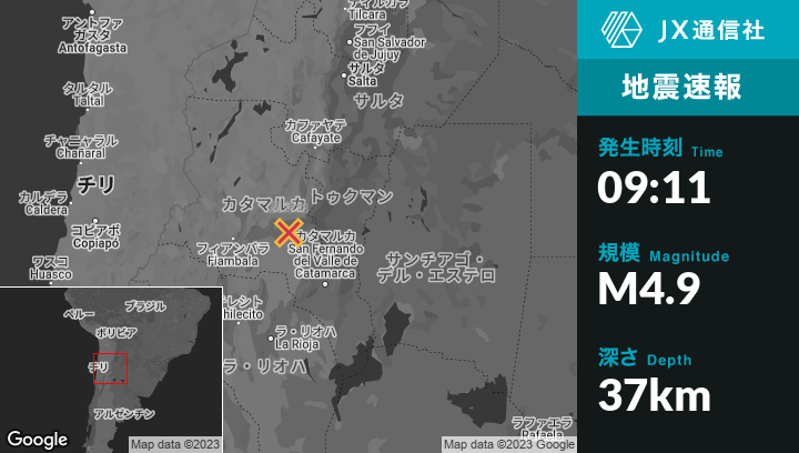 6月03日 09:11頃、アルゼンチンのAndalgaláから西北西23kmの地点でM4.9の地震がありました。