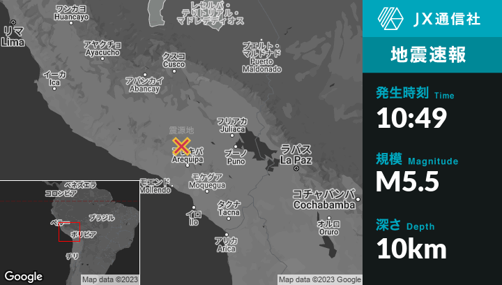 6月03日 10:49頃、ペルーのMacaから南南東9kmの地点でM5.5の地震がありました。