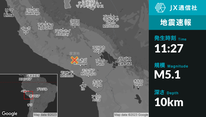 6月03日 11:27頃、ペルーのLlutaから北14kmの地点でM5.1の地震がありました。