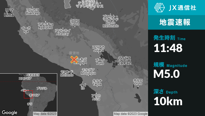 6月03日 11:48頃、ペルーのLlutaから北14kmの地点でM5.0の地震がありました。
