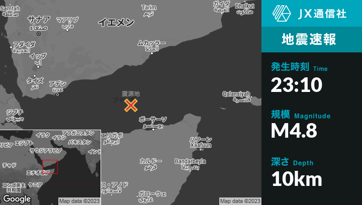 6月03日 23:10頃、ソマリアのLas Khoreyから北143kmの地点でM4.8の地震がありました。