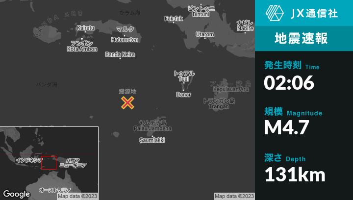 | 震源地 | インドネシアのTualから西南西290kmの地点 |