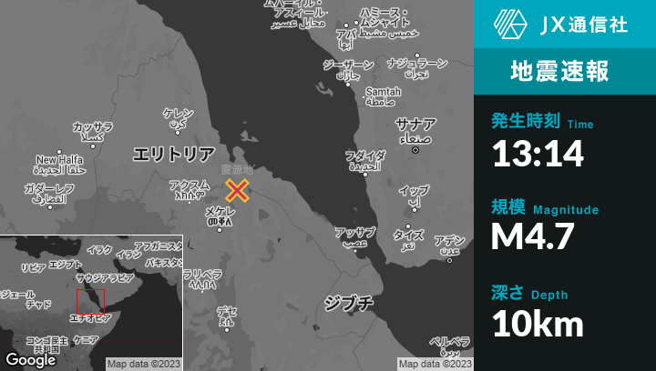 6月04日 13:14頃、エチオピアのĀdīgratから東北東54kmの地点でM4.7の地震がありました。