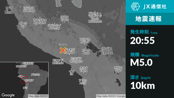 6月05日 20:55頃、ペルーのLlutaから北西18kmの地点でM5.0の地震がありました。